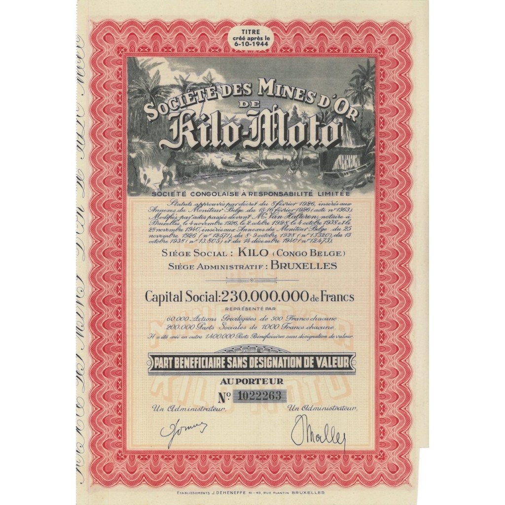 SOCIETE DES MINES D'OR DE KILO-MOTO - UNA AZIONE - 1944