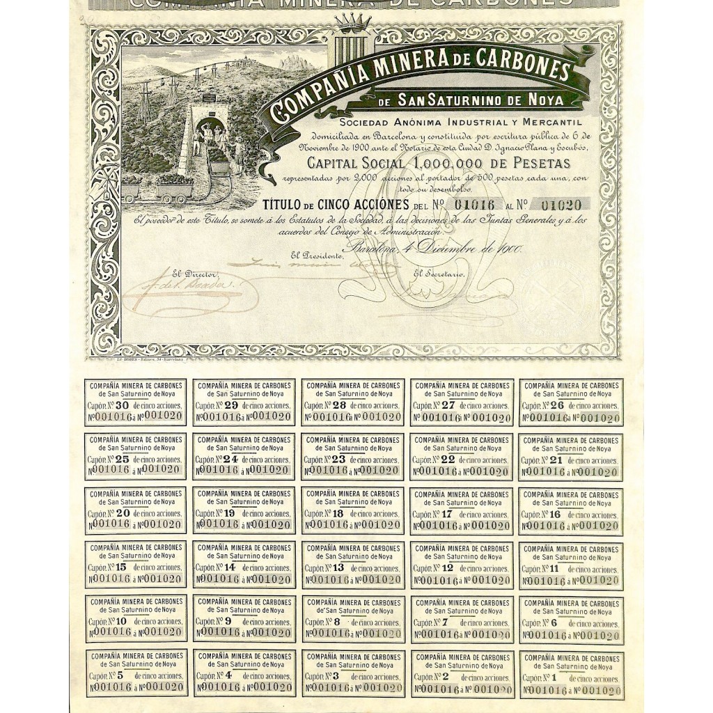 1900 - MINERA DE CARBONES DE SAN SATURNINO DE NOYA COMP. (5 AZIONI)