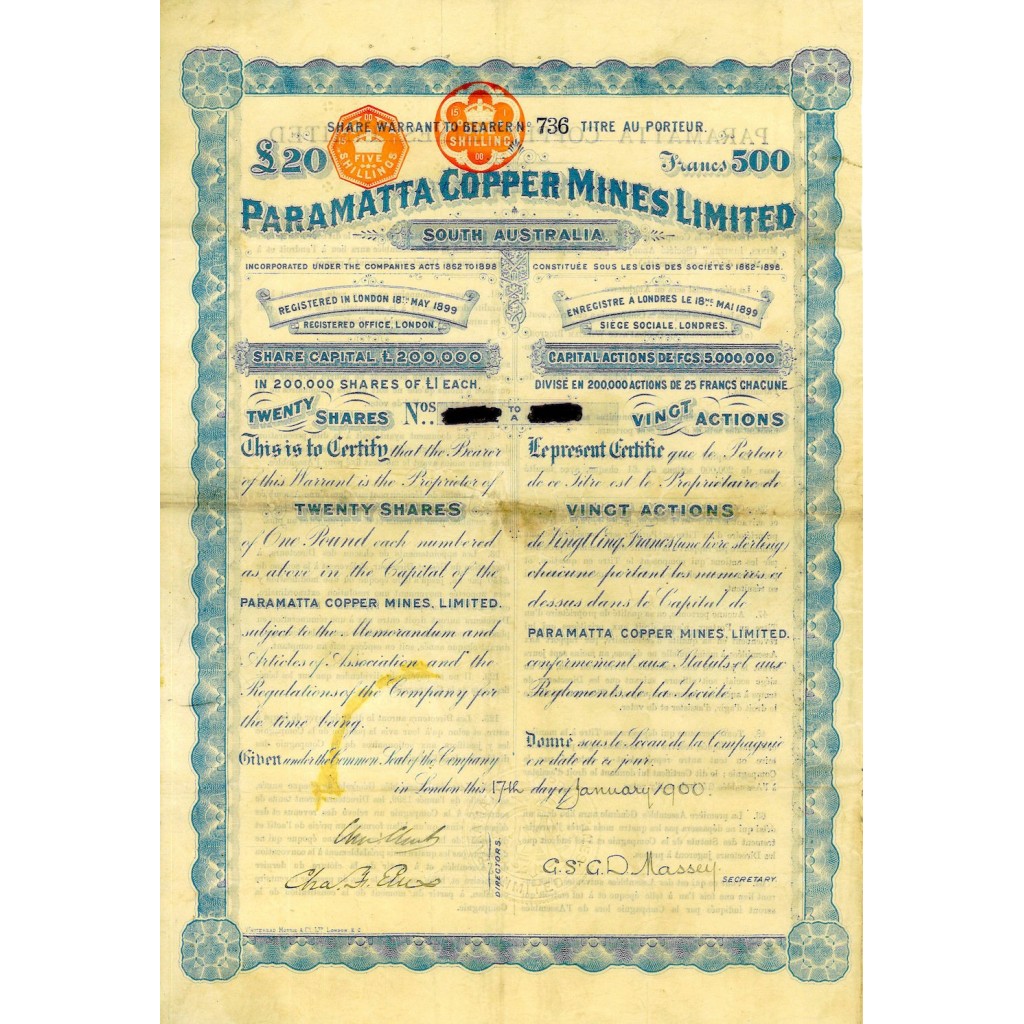 1900 - PARAMATTA COPPER MINES LIMITED (20 AZIONI) - LONDRA