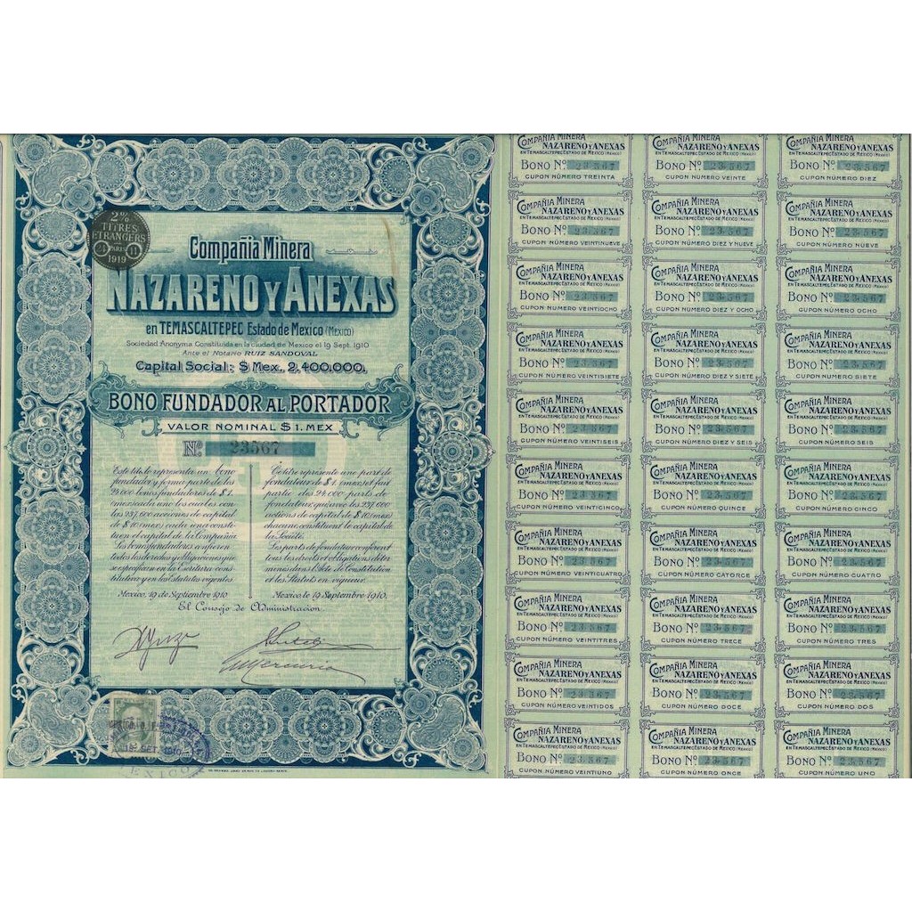 The document you see is a bond certificate issued by Compañía Minera Nazareno y Anexas, a mining company established in 1910 in Temascaltepec, State of Mexico. This bond represents a significant piece of Mexico's industrial history, as the mining sector was one of the pillars of the Mexican economy during the early decades of the 20th century.
