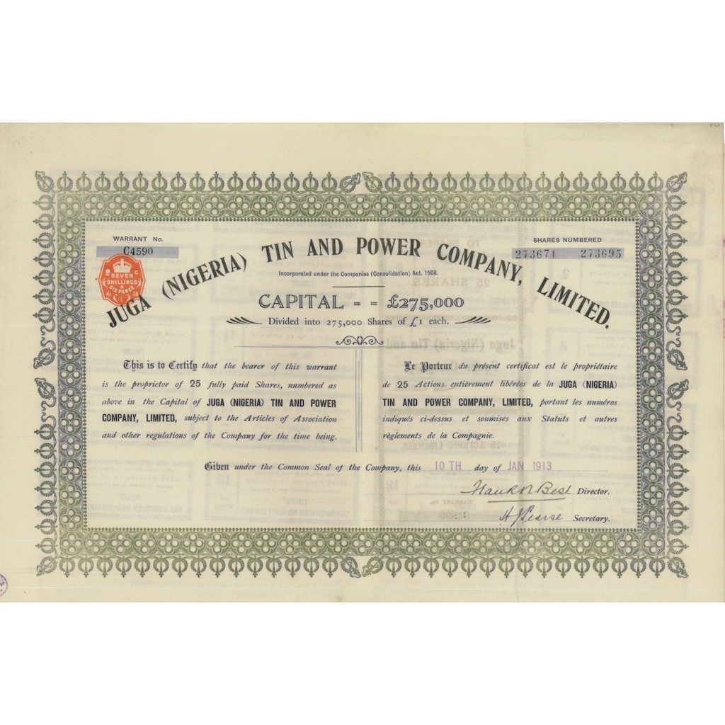 JUGA TIN AND POWER COMPANY, LTD. 25 AZIONI - 1913