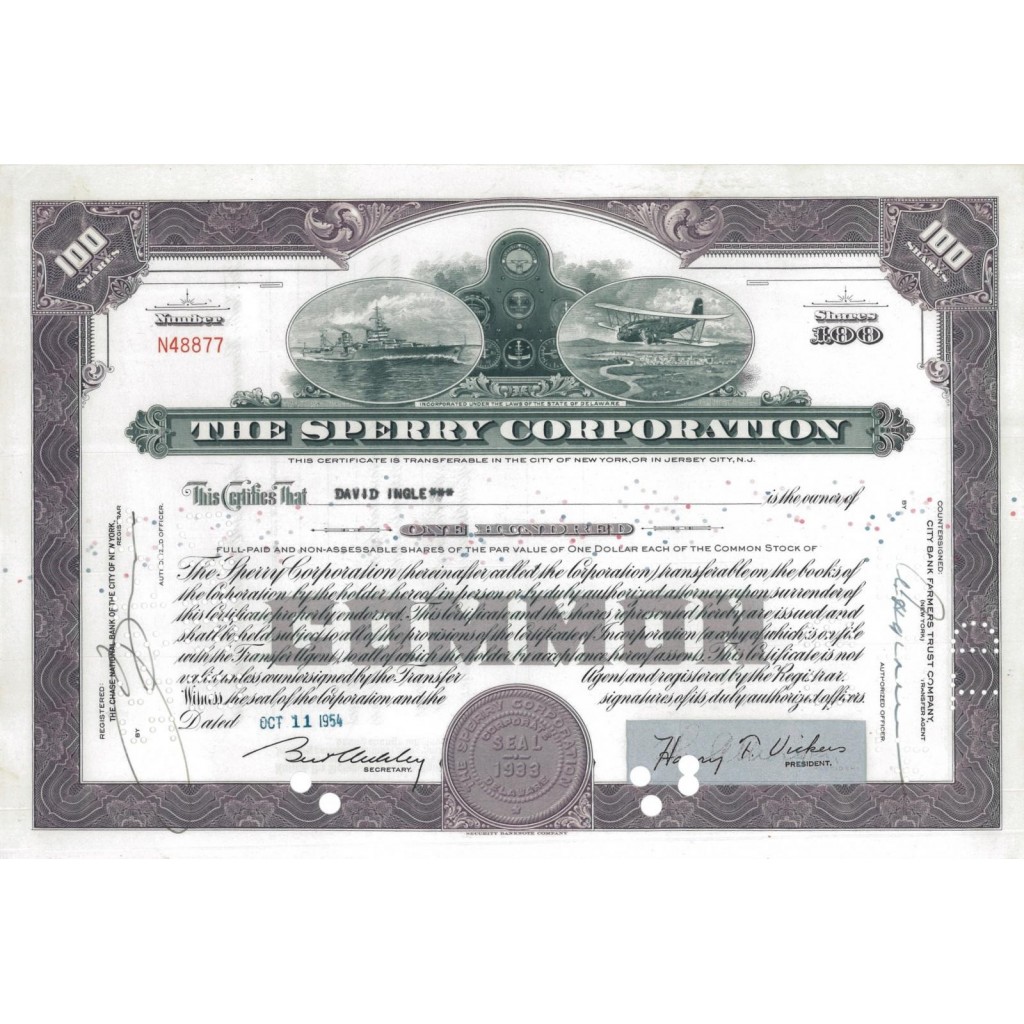 THE SPERRY CORPORATION - 100 AZIONI - 1954