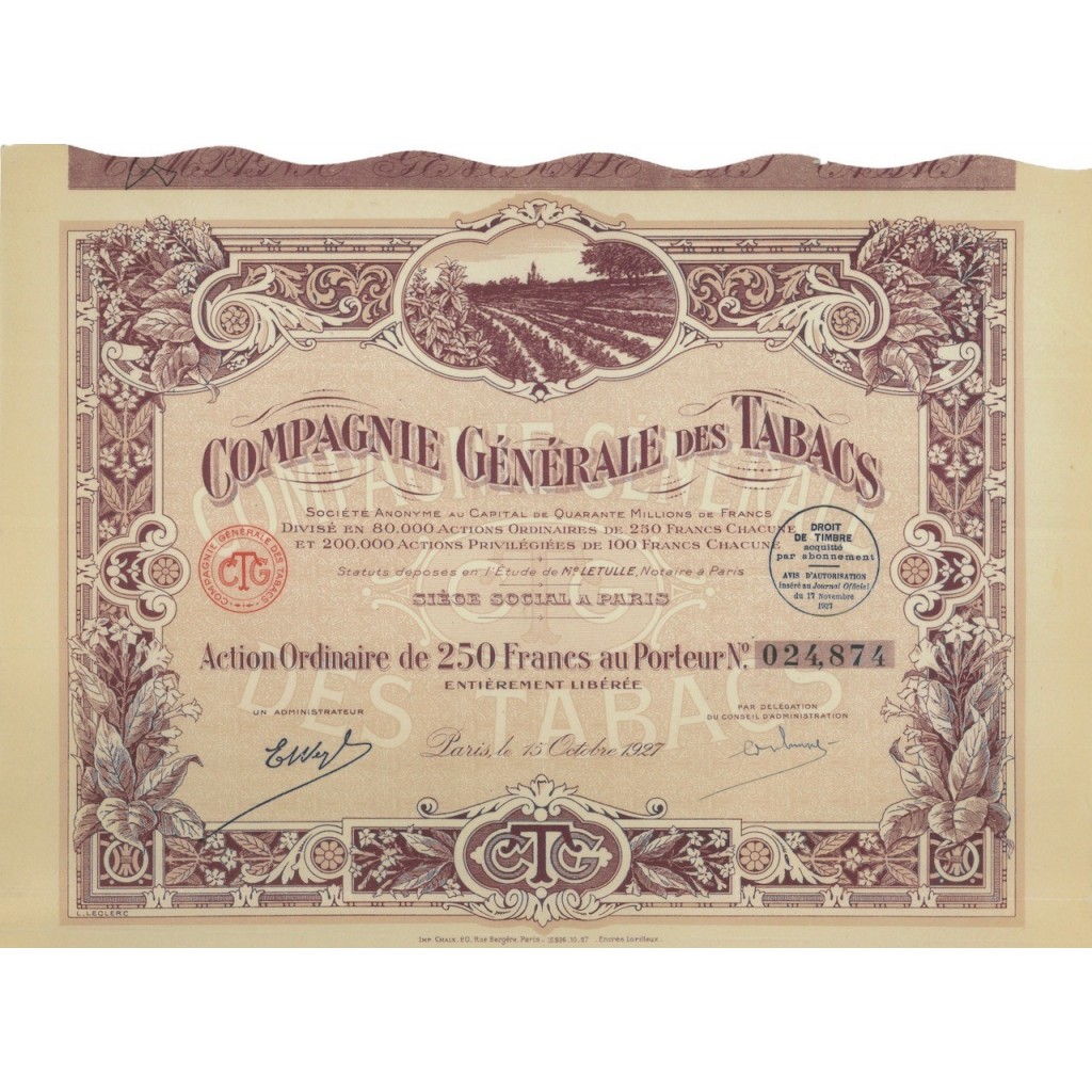 COMPAGNIE GENERALE DES TABACS - 1 AZIONE - 1927