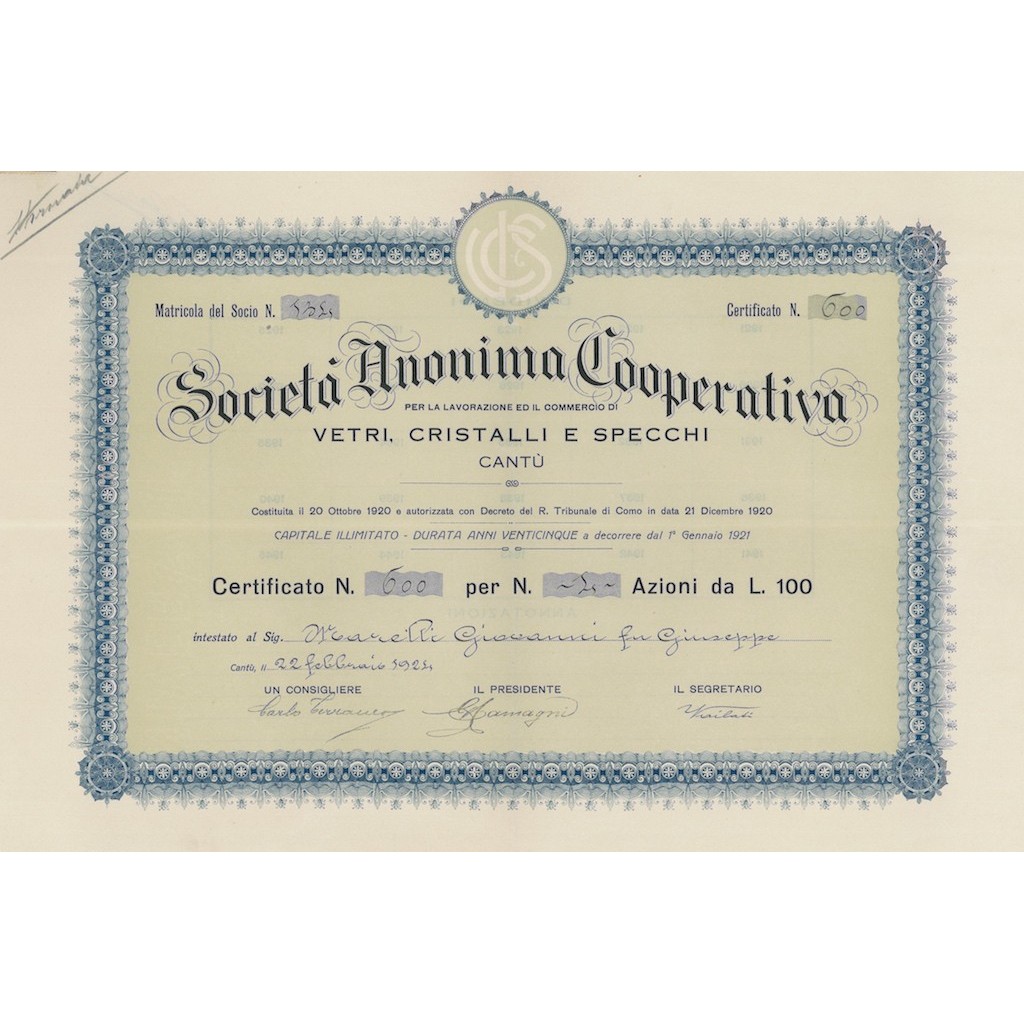 Certificato azionario autentico della Società Anonima Cooperativa per la Lavorazione ed il Commercio di Vetri, Cristalli e Specchi, con sede a Cantù. Il certificato, emesso nel 1925, rappresenta azioni da 100 Lire ciascuna ed è intestato a un socio della cooperativa.