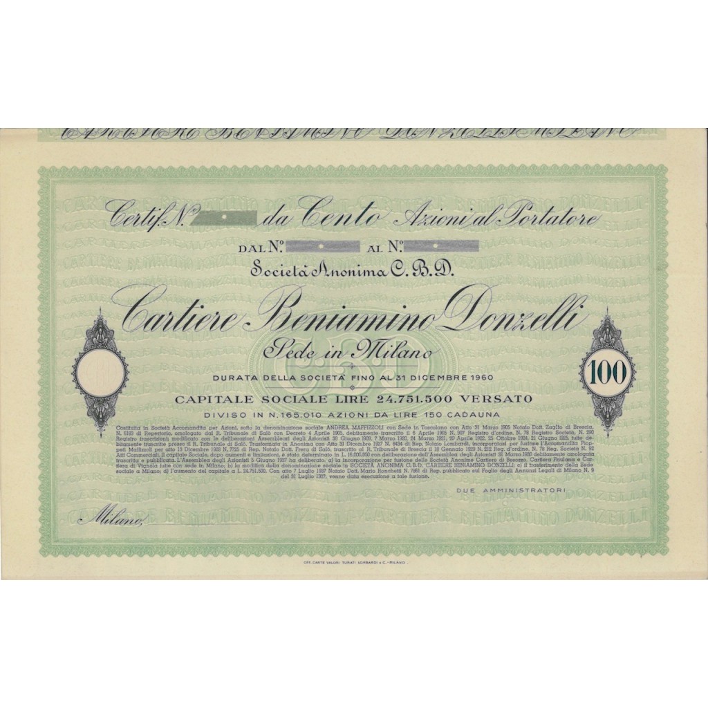 CERTIFICATO DA 100 AZIONI AL PORTATORE