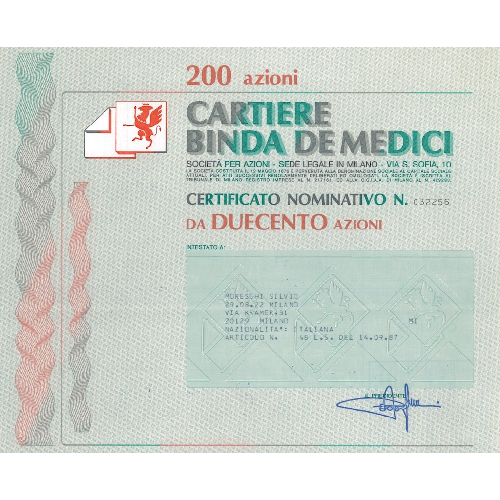 CARTIERE BINDA DE MEDICI 200 AZIONI - MILANO 1987