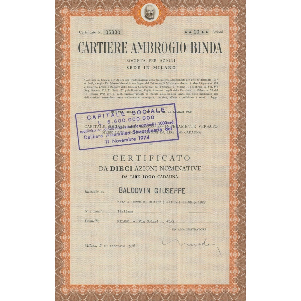 CERTIFICATO DA 10 AZIONI NOMINATIVE