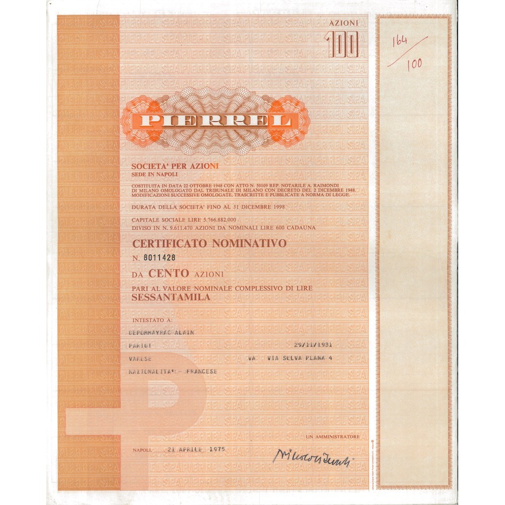CERTIFICATO NOMINATIVO DA 100 AZIONI