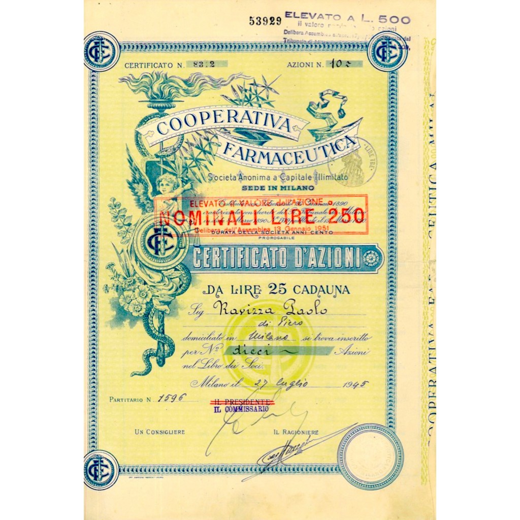 Raro documento storico finanziario dell'antica cooperativa farmaceutica milanese. Splendida grafica con immagine putto con le ali e la grafica che rappresenta il Bastone di Asclepio antico simbolo greco associato alla medicina. Consiste in un serpente attorcigliato intorno ad una verga. Asclepio era il dio della salute nell'antico pantheon greco. Il nome latinizzato del dio era Esculapio. Fu istruito nell'arte medica dal centauro Chirone. Nel centro del simbolo il logo della Società. C'e' anche la pagina intera delle cedole.
