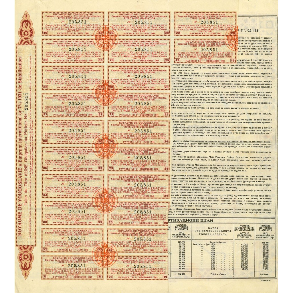Il documento rappresenta un'obbligazione internazionale emessa dal Regno di Jugoslavia nel 1931, con un tasso di interesse del 7%. Questa obbligazione era destinata a stabilizzare l'economia jugoslava durante un periodo di turbolenza economica globale.
