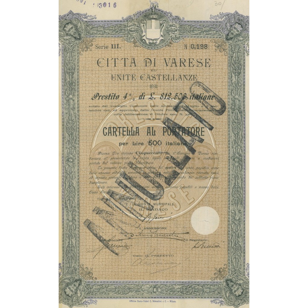 Cartella al portatore per lire 500 italiane.