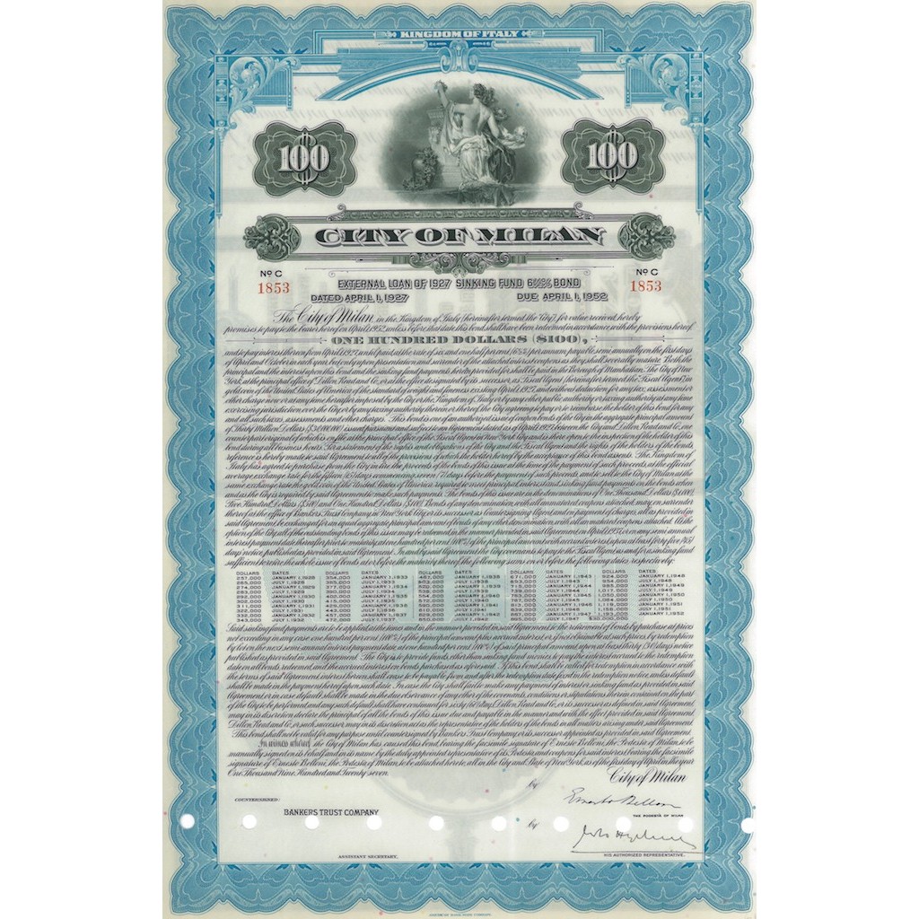 CITY OF MILAN 1 OBBLIGAZIONE DA 100$ MILANO 1927