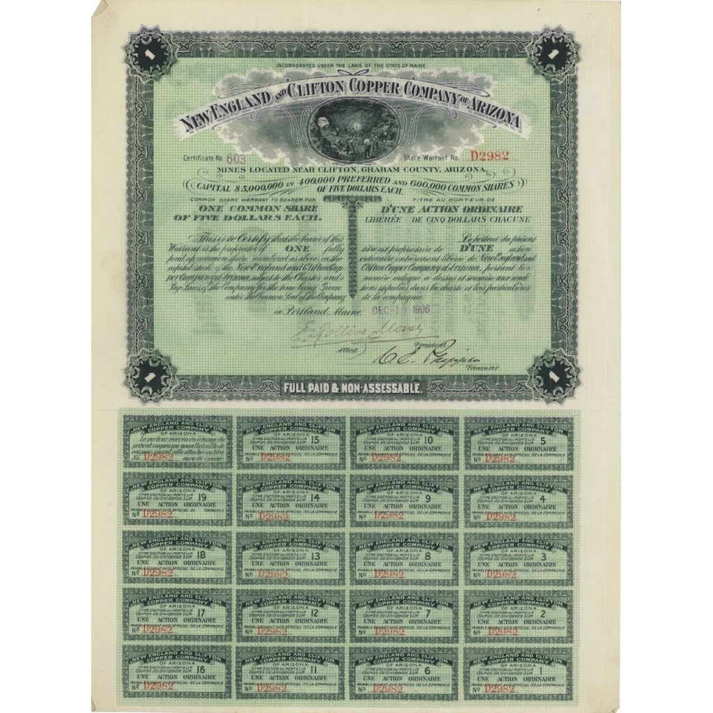 NEW ENGLAND AND CLIFTON COPPER COMPANY OF ARIZONA 1 AZIONE 1906