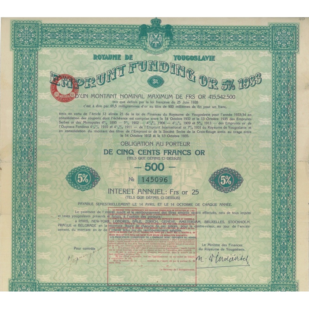 ROYAUME DE YOUGOSLAVIE EMPRUNT FUINDING OR 5 PER CENT - 1933