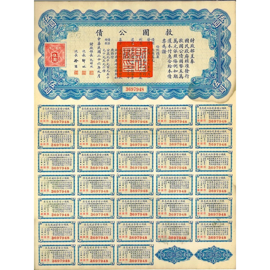 In 1937, China was amid significant political and military challenges, particularly with the onset of the Second Sino-Japanese War. To bolster national defense and economic stability, the Chinese government issued liberty bonds to raise funds. These bonds were a call to patriotic duty, encouraging citizens to invest in the nation's future. The full set of coupons attached to this bond indicates that it was a long-term investment, with periodic interest payments that would have provided a steady return to the bondholder.