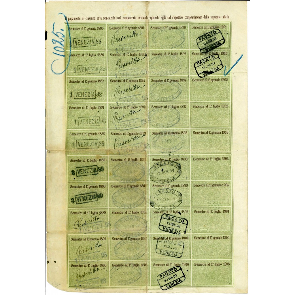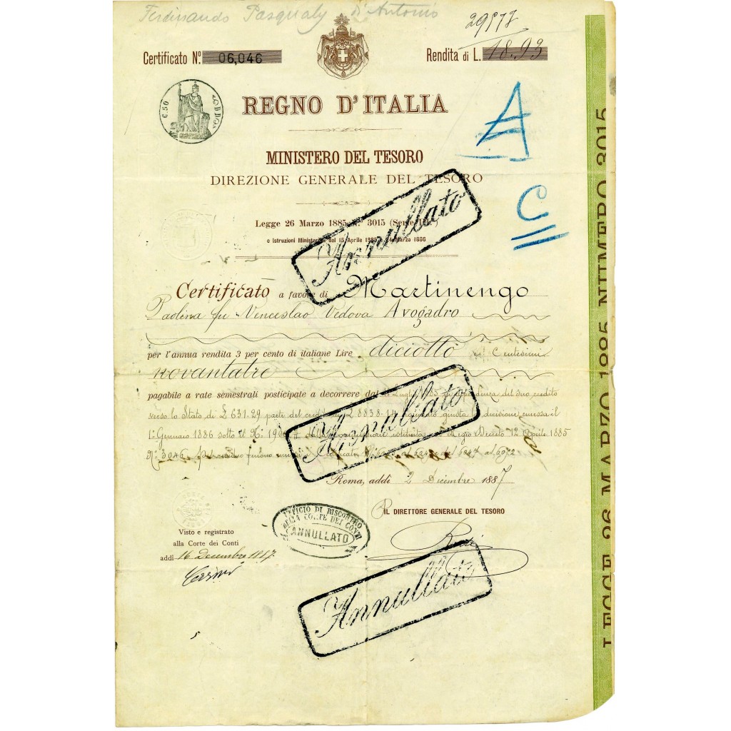 1887 - MINISTERO DEL TESORO 3% RENDITA L. 18,93 - DEBITO PUBBLICO REGNO D'ITALIA - ROMA