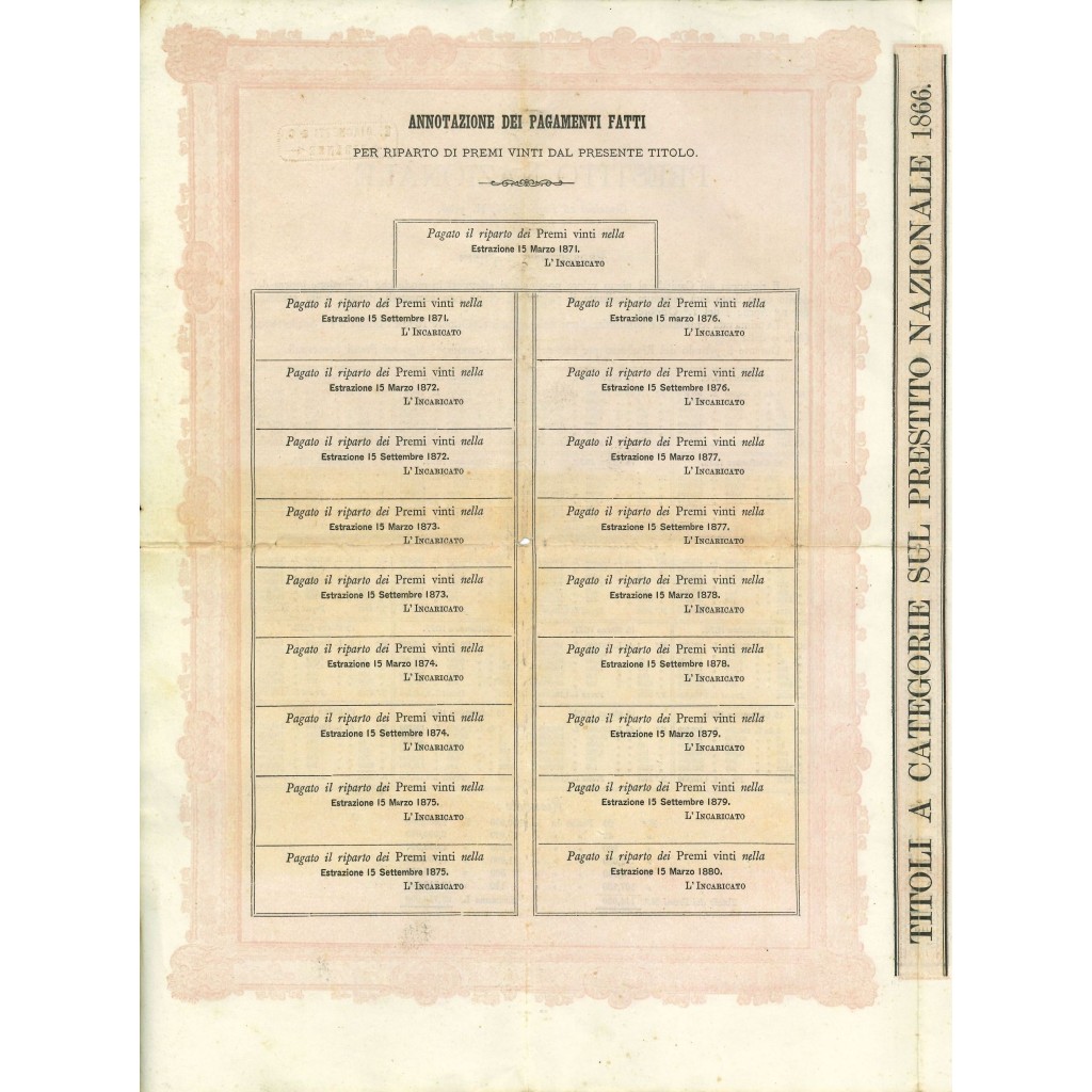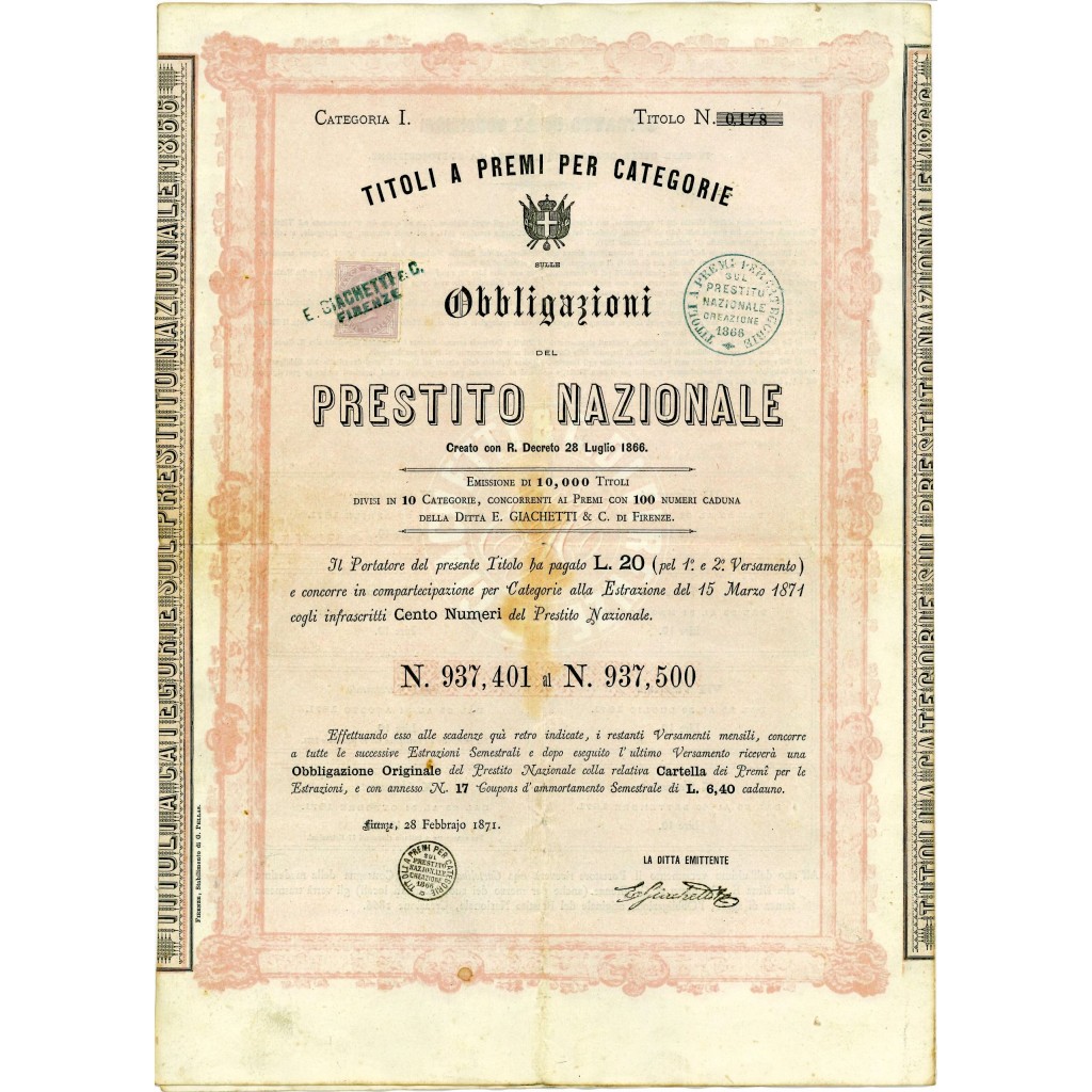 1871 - PRESTITO NAZIONALE DEL REGNO D'ITALIA OBBLIGAZIONI L. 20 - FIRENZE