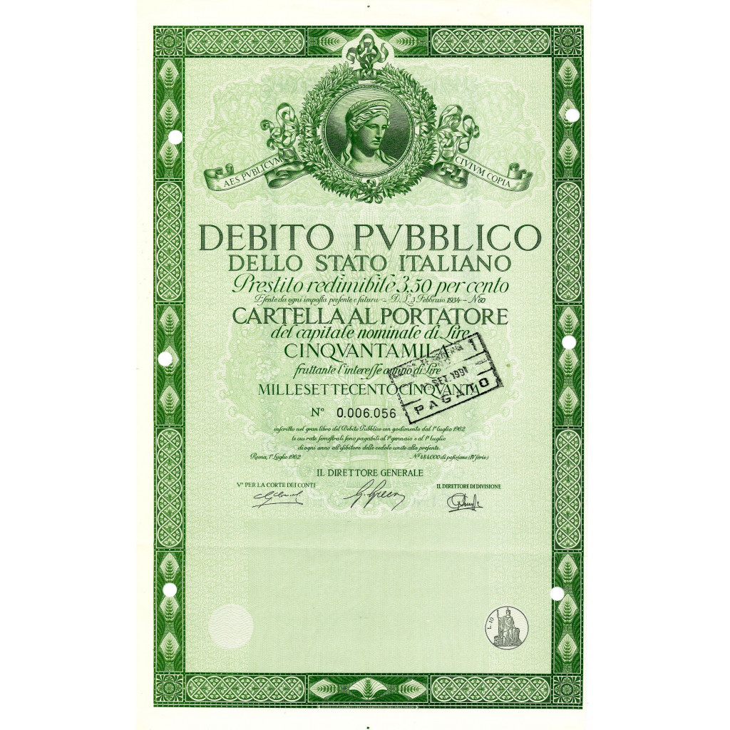 The history of loans from the period of the Italian State's Public Debt redeemable at 3.5 per cent bearer bonds in denominations of 100 to 100,000 lire represents an aspect of the country's financial system and debt policies during that specific period. These financial instruments helped support the Italian economy and cover public expenses, providing an investment opportunity for Italian citizens.