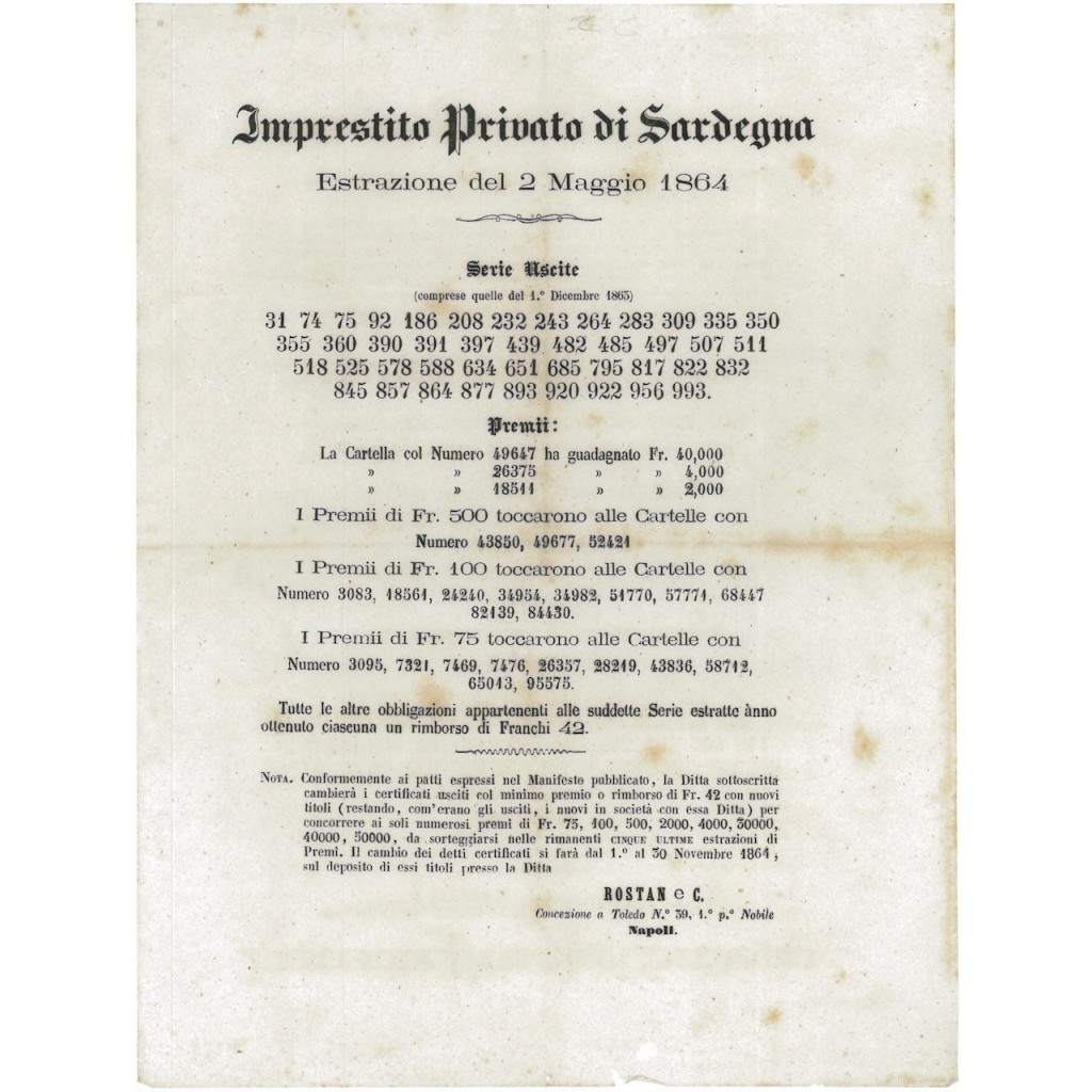 IMP. PRIVATO RE DI SARDEGNA - ESTRAZIONE DEL 1 DICEMBRE, 1864