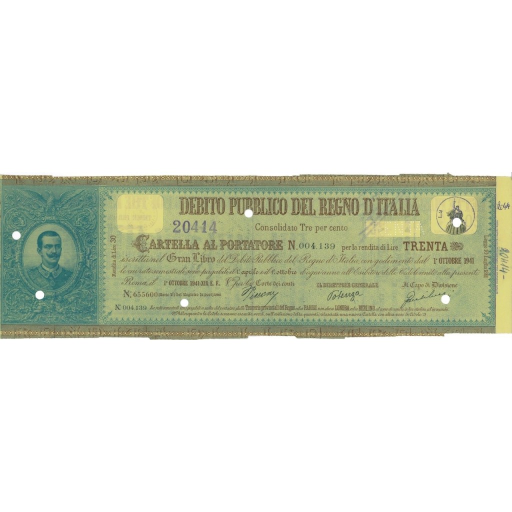 CARTELLA AL PORTATORE PER LA RENDITA DI LIRE TRENTA - ISCRITTA AL GRAN LIBRO DEL DEBITO PUBBLICO DEL REGNO D'ITALIA