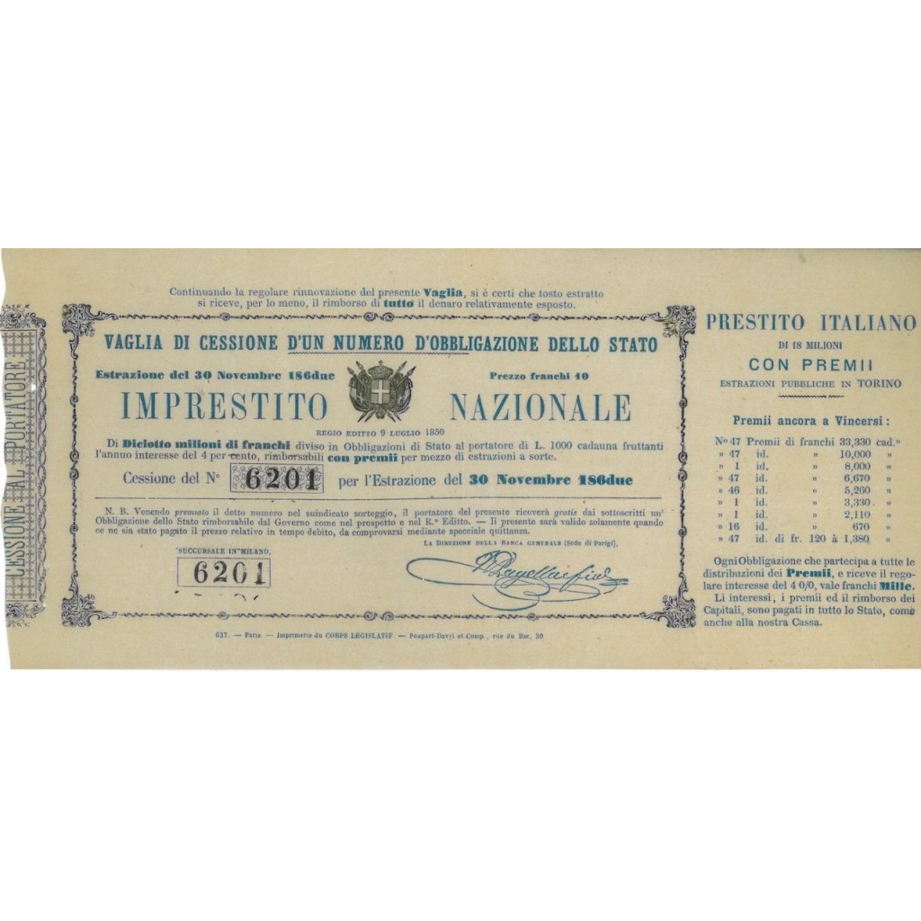 IMPRESTITO NAZIONALE - REGIO EDITTO 9 LUGLIO 1850 - ESTRAZIONE 30 NOVEMBRE 1862