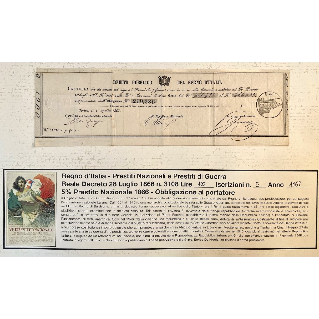 1867 - PRESTITO NAZIONALE CARTELLA PER OBBLIGAZIONE LIRE 100 N. 5 ISCRIZ. - REGNO D'ITALIA - TORINO