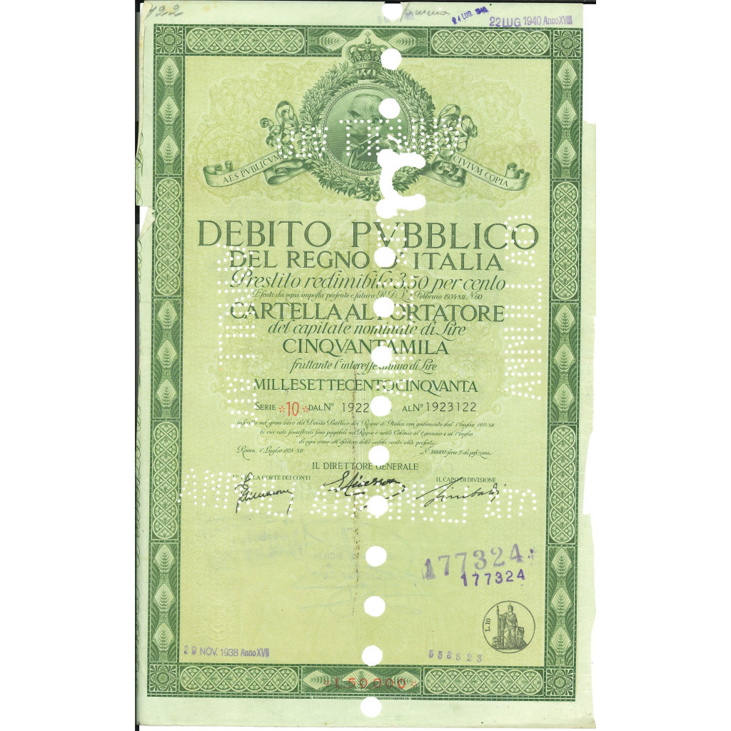 CARTELLA 50000 LIRE INTERESSE 3,50 % REGNO D'ITALIA 1934