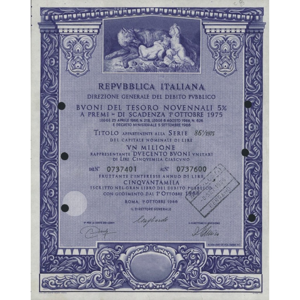 Bearer Treasury Bonds were physical financial instruments that could be transferred by physical delivery of the security. The denominations of 5 per cent nine-year Treasury bonds ranged from 5,000 to 1,000,000 Italian lire. At the time of issue, these bonds were denominated in Italian lira, which was Italy's national currency before the adoption of the euro.
