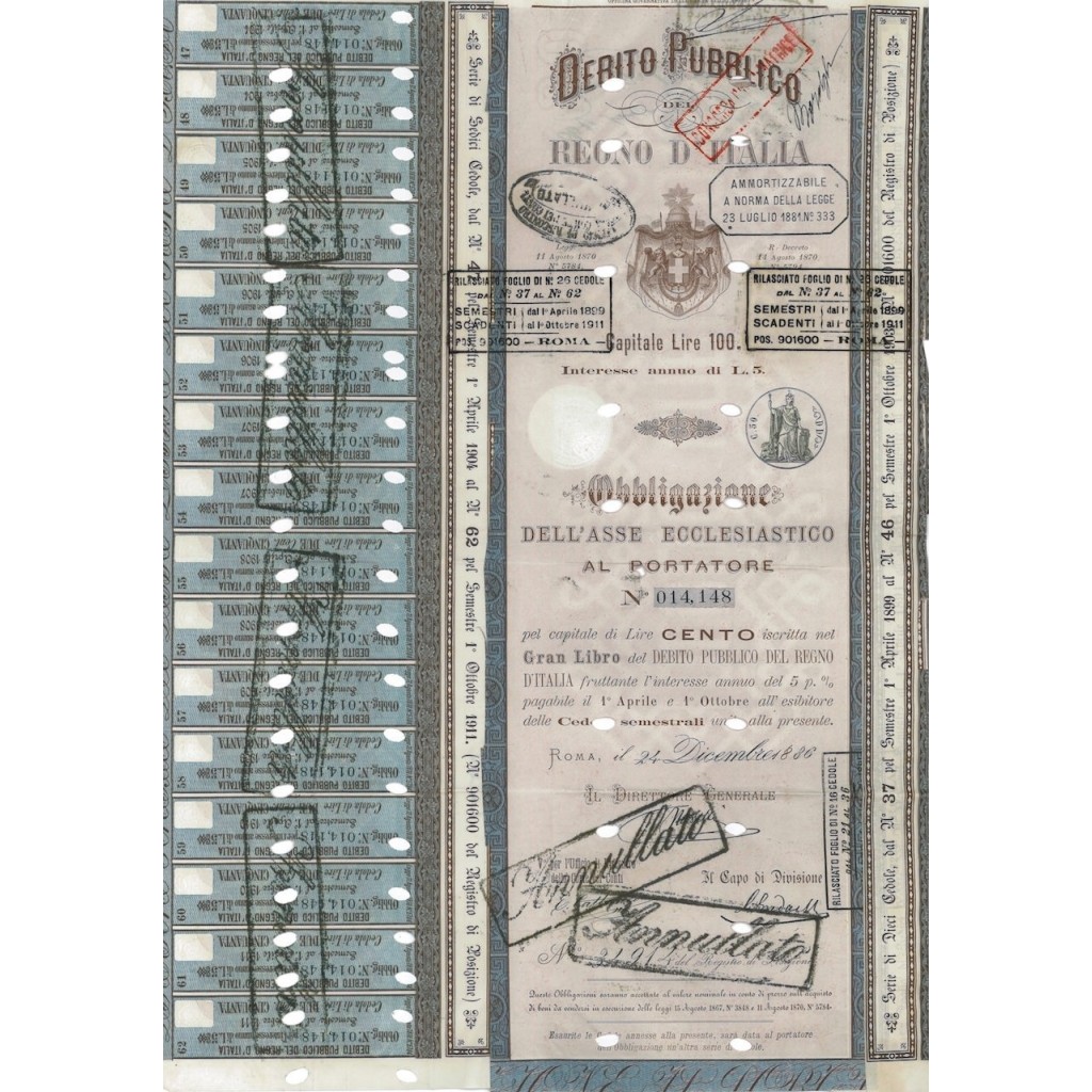 1886 - 1 OBBLIGAZIONE ASSE ECCLESIASTICO D. P. REGNO D'ITALIA L. 100