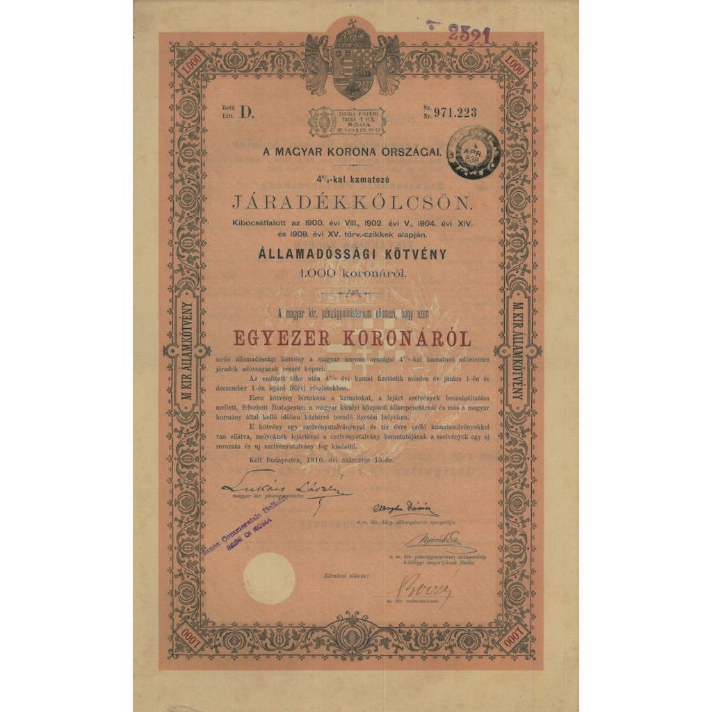 MAGYAR KORONA ORSZAGAI - 1000 KORONAROL - BUDAPEST 1910