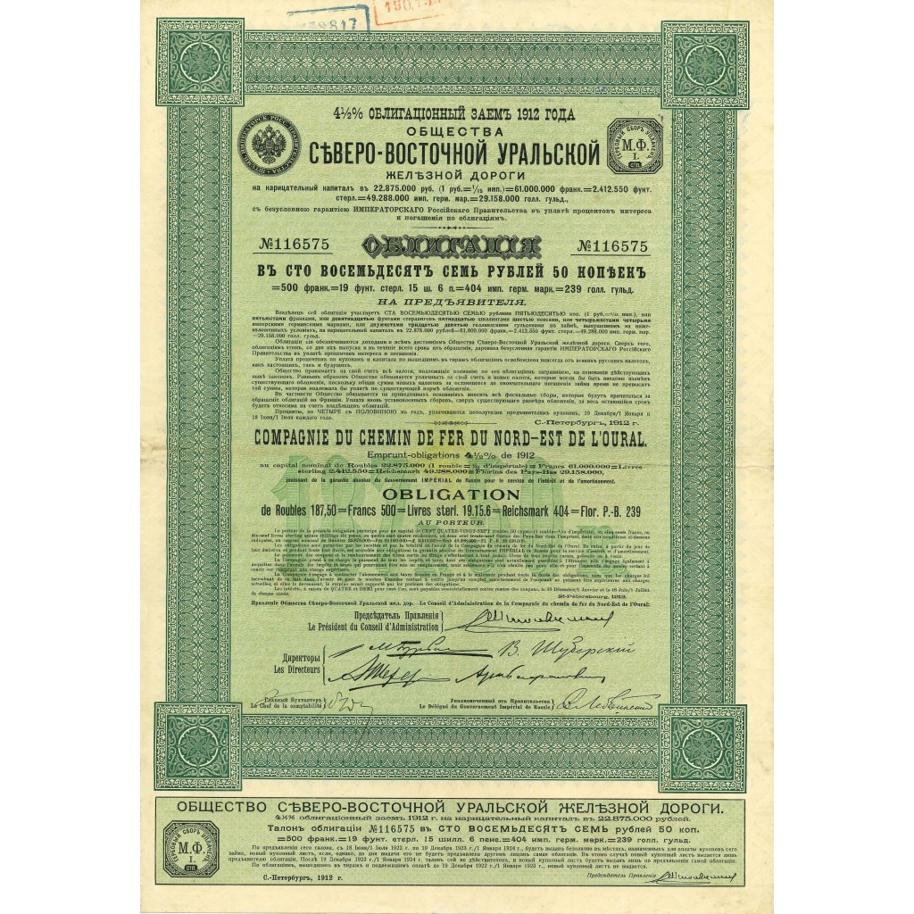 The document of the Compagnie du Chemin de Fer du Nord-Est de l'Oural is a perfect example of how scripophily can offer a unique perspective on the economic growth of the Russian Empire. The importance of this document lies in its rarity, its state of preservation, and its artistic beauty, elements that make it a sought-after piece by collectors.