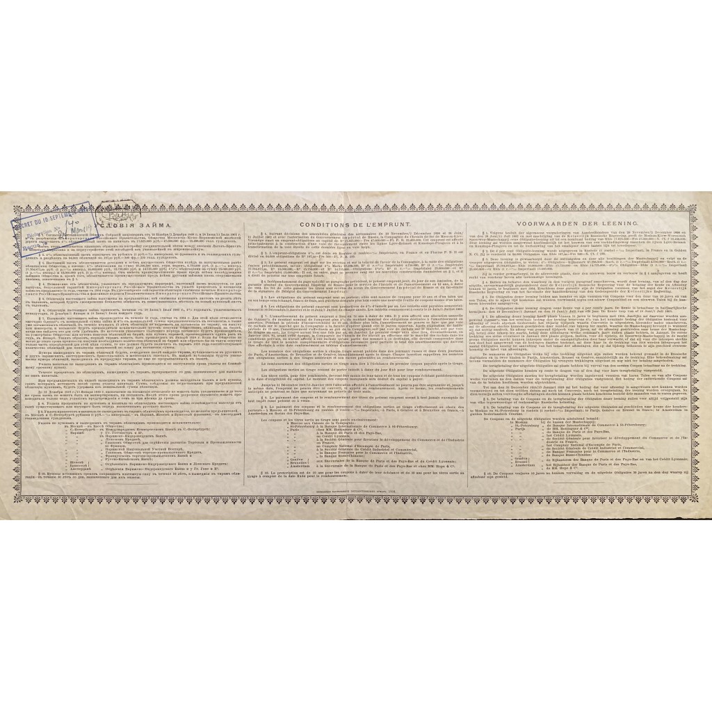 This certificate was originally issued to a European investor, as evidenced by the numbering in international currencies and the presence of three languages. The title has been well-preserved and was recently acquired by a collector specializing in historical Russian documents.