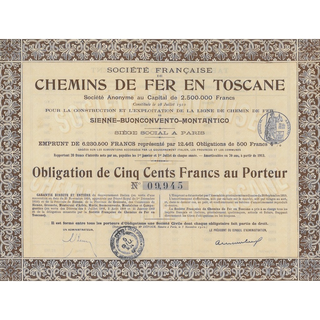 The company Française Chemins de Fer en Toscane was established with a capital of 2,500,000 francs. Its purpose was to build and explore the railway line connecting Siena, Buonconvento and Montalcino, in Tuscany, Italy.