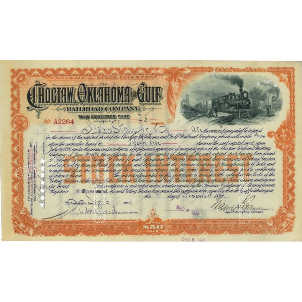 CHOCTAW OKLAHOMA AND GULF RAILROAD COMPANY - 25 AZIONI 1897