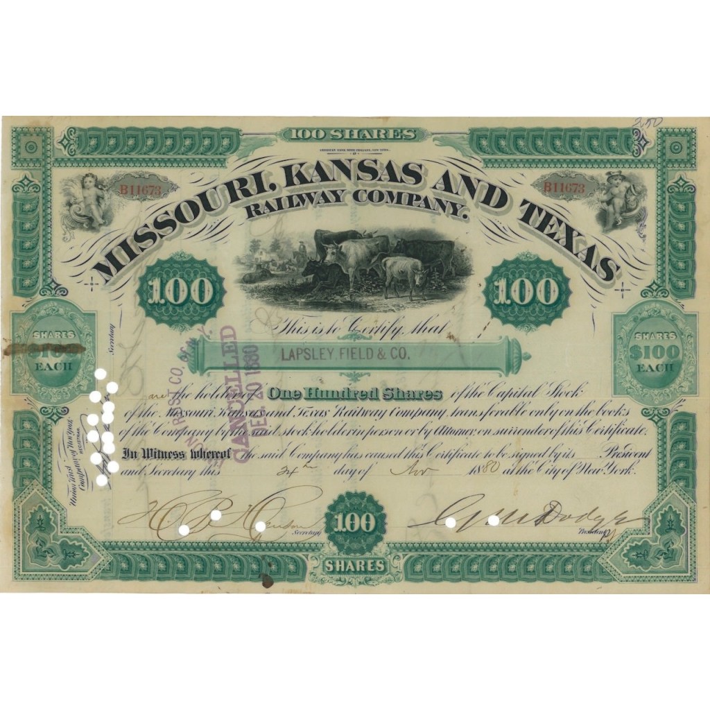 MISSOURI, KANSAS AND TEXAS RAILWAY COMPANY - 100 AZIONI - 1880