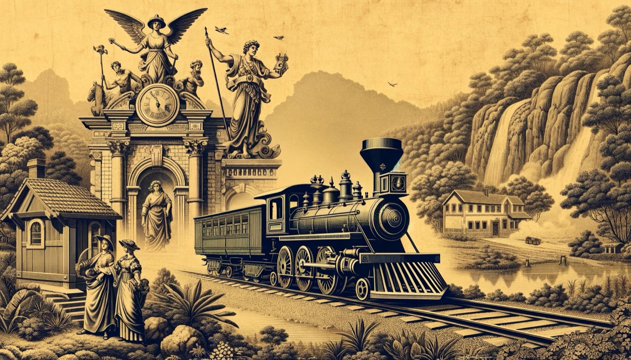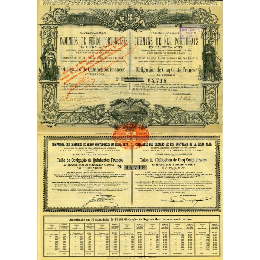 L'immagine appresenta una scena storica della Companhia dos Caminhos de Ferro Portugueses da Beira Alta, ispirata alle illustrazioni classiche presenti nell'obbligazione. La scena include una locomotiva a vapore vintage su una ferrovia, circondata dalla rigogliosa campagna portoghese. Ai lati, figure allegoriche simboleggiano il progresso e l'industria, riflettendo lo stile delle illustrazioni del XIX secolo. Sullo sfondo, si vede una piccola stazione ferroviaria con elementi architettonici tipici dell'epoca, evocando un senso di importanza storica e avanzamento industriale.