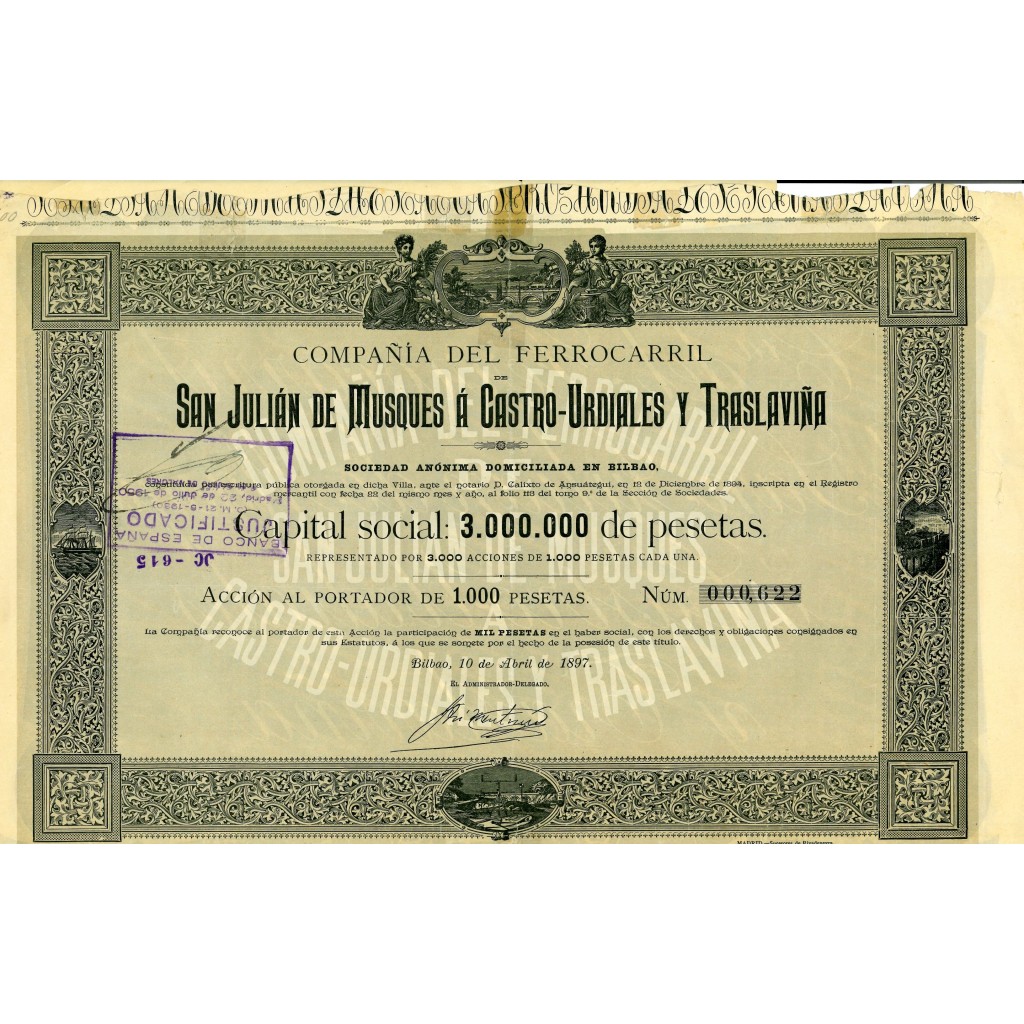 1897 - FERROCARRIL DE SAN JULIAN DE MUSQUES A CASTRO-URDIALES Y TRASLAVINA COMP. DEL (AZIONE)