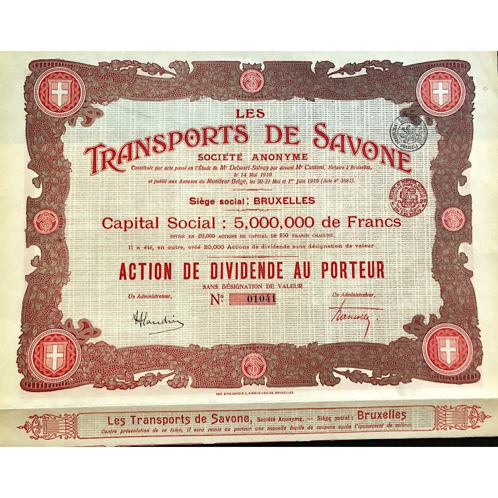 1910 - LES TRANSPORTS DE SAVONE ACTION DE DIVIDENDE AU PORTEUR