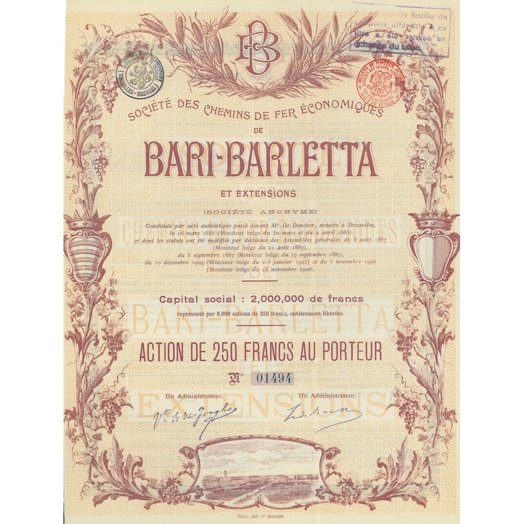 SOCIÉTÉ CHEMINS DE FER ECONOMIQUES BARI-BARLETTA 1 AZIONE MENITEUR BELGE