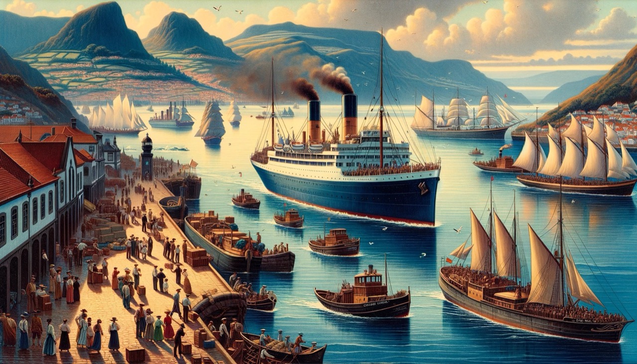 Immagine: Mostra una scena marittima dei primi del XX secolo, con una nave a vapore che naviga nell’Oceano Atlantico, affiancata da barche più piccole e con l’arcipelago delle Azzorre sullo sfondo. L’atmosfera vibrante e i dettagli ricchi sottolineano l’importanza del commercio marittimo e della crescita economica di quell’epoca.