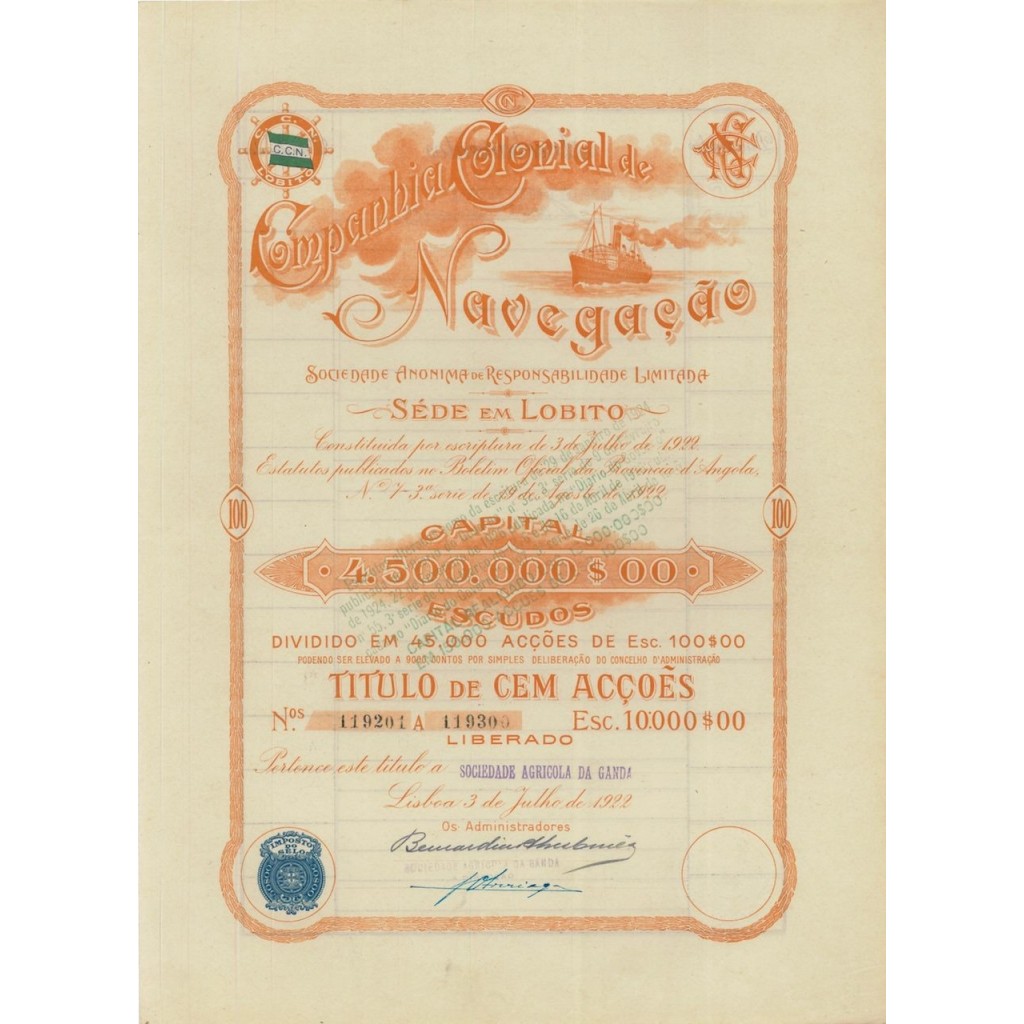 Questo certificato rappresenta una quota di capitale di 4.500.000 escudos, suddiviso in 5.000 azioni da 1000 escudos ciascuna. Il documento specifica che la quota azionaria in questione è composta da cento azioni del valore di 10.000 escudos ciascuna.