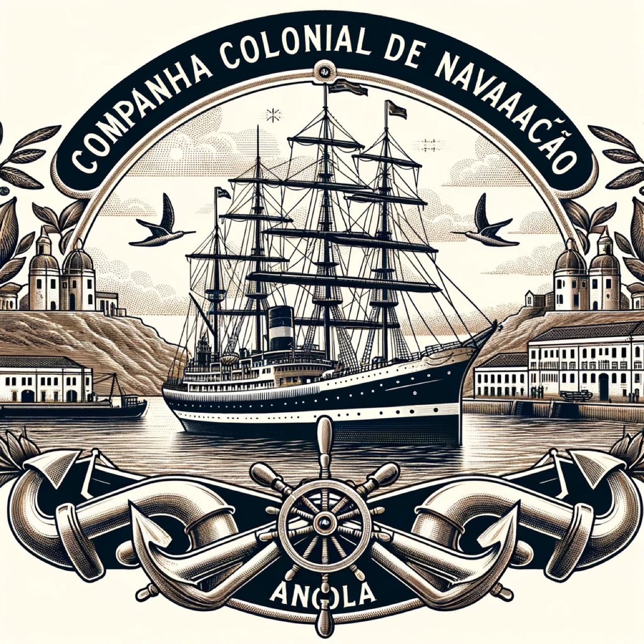 Illustrazione che rappresenta la storia della Companhia Colonial de Navegação, ispirata agli elementi visivi presenti nel certificato e alla storia della società. L’immagine raffigura una nave mercantile in navigazione con lo sfondo del porto di Lobito, decorata con elementi tipici dell’estetica coloniale portoghese degli anni ‘20, come l’ancora e la ruota di timone. Questa rappresentazione mira a evocare l’eleganza e l’importanza storica del commercio marittimo del primo Novecento.