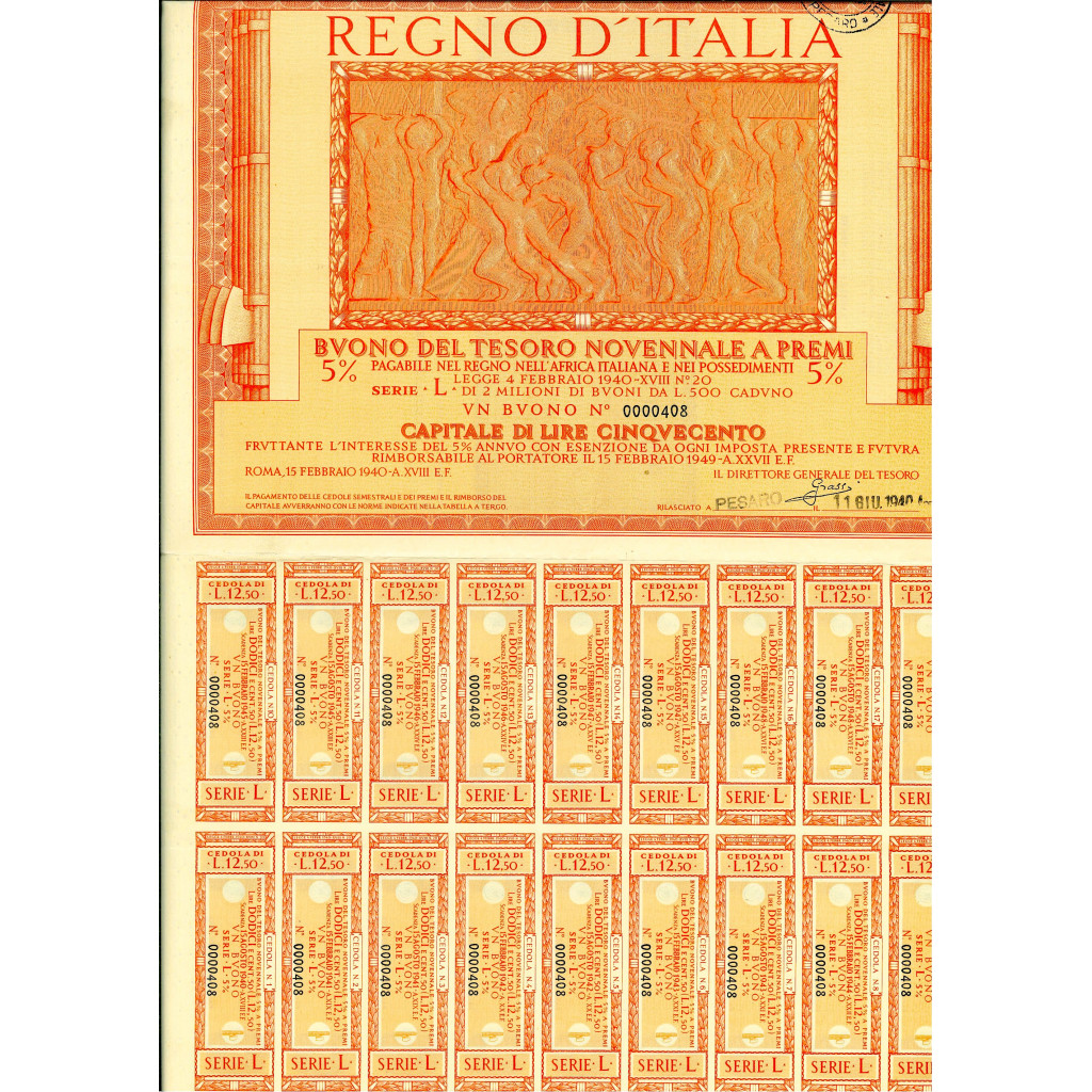 Hai mai sognato di possedere un pezzo di storia finanziaria? Ora hai l'opportunità di farlo con i prestigiosi Buoni del Tesoro novennali al 5% a premi emessi nel Regno d'Italia, con il  Regio Decreto Legge del 4 febbraio 1940 n. 20. È il momento perfetto per immergersi in questa affascinante avventura finanziaria!