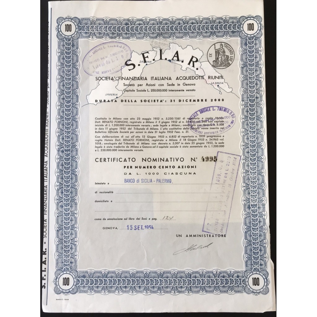 S.F.I.A.R. - 100 AZIONI DA 1000 LIRE - GENOVA 1954