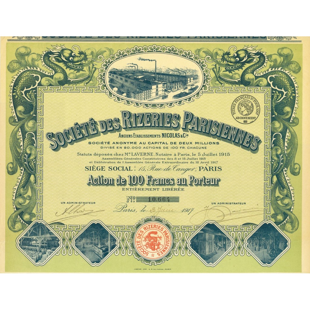1917 - SOCIETE DES RIZERIES PARISIENNES - ACTION DE 100 FRANCS AU PORTEUR