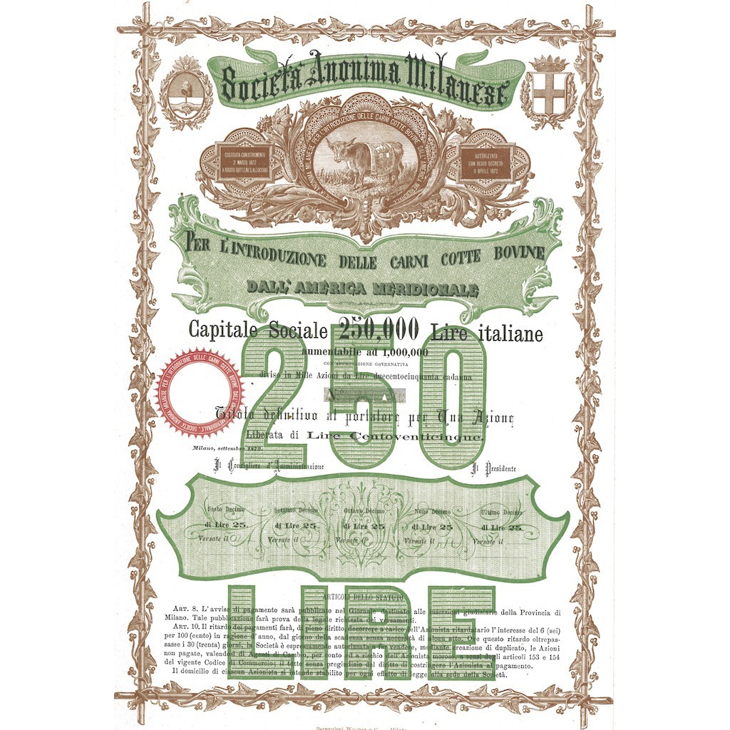 1872 - S.A. MILANESE PER L'INTR. DELLE CARNI COTTE DAL SUD AMERICA - 1 AZIONE