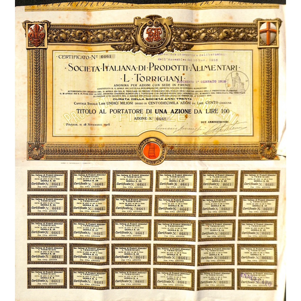 Raro titolo storico della ditta di alimentari di Sesto Fiorentino (FI). Stemma della società in alto nel centro e stemmi di Firenze e di Sesto Fiorentino ai lati. Simbolo della scala "Salire sempre" in basso nel centro.
