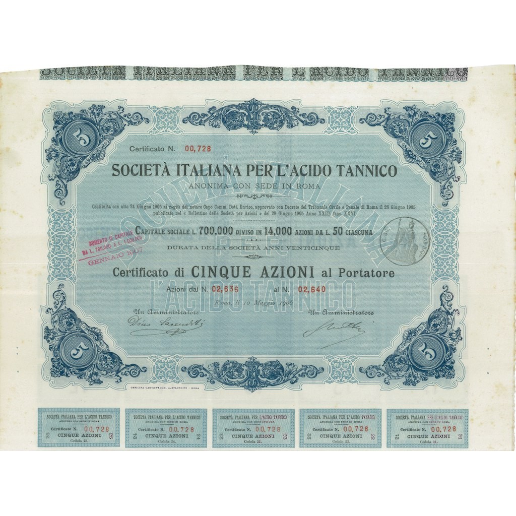 Certificato di 5 azioni al portatore.
