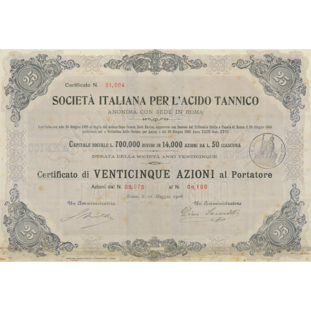 Certificato di 25 azioni al portatore.