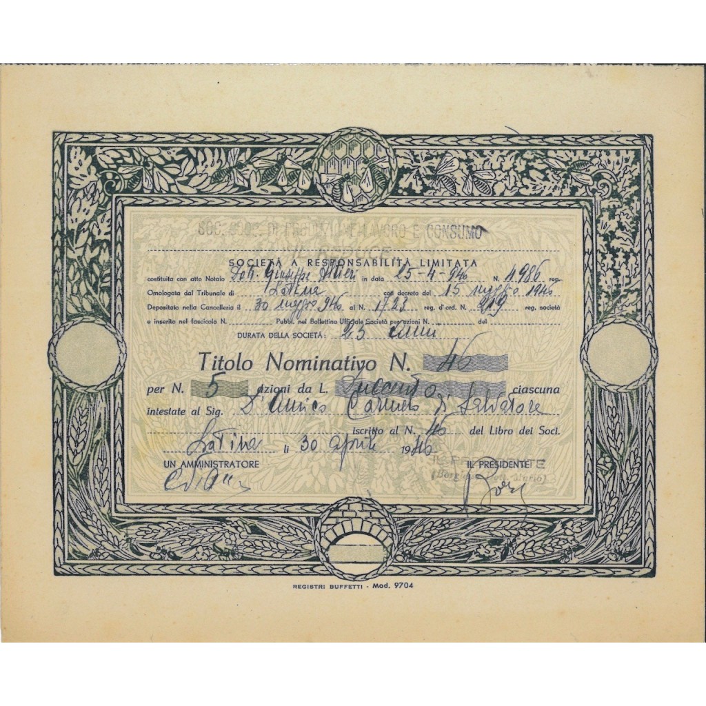 La cooperativa “Il Reduce” fu fondata nell’Italia del secondo dopoguerra, a Latina, città simbolo della bonifica integrale e del lavoro collettivo. Il nome della cooperativa richiama il reinserimento dei reduci di guerra nella vita produttiva civile, attraverso iniziative mutualistiche incentrate sulla produzione, il consumo e il lavoro. Costituita ufficialmente nel 1946, questa cooperativa esprime un forte valore sociale in un periodo di ricostruzione materiale e morale del Paese. Il certificato, sobrio ma decorato con motivi agricoli e simboli del lavoro, è un documento raro e significativo per collezionisti di titoli cooperativi e della storia del lavoro in Italia.